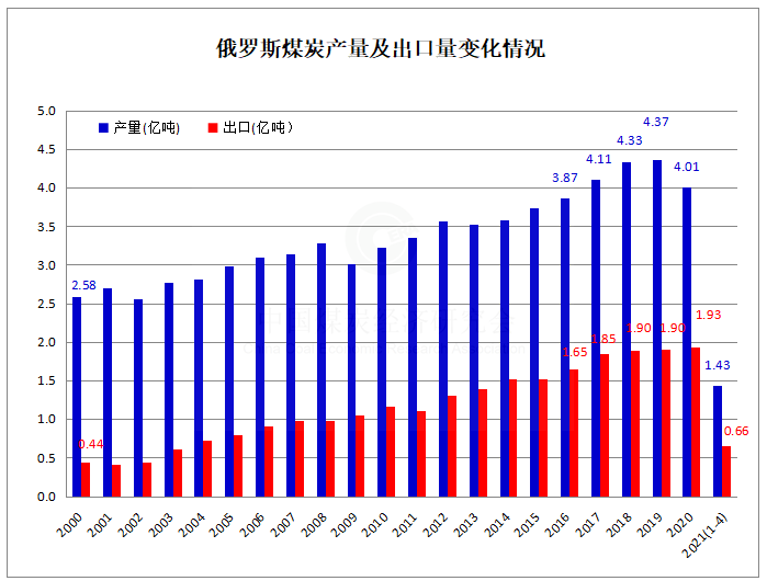 2021年1-4月俄羅斯煤炭產(chǎn)量和出口分別增長8.57%和17.57%
