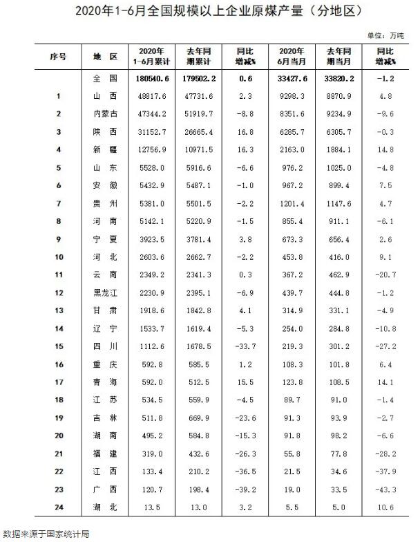2020年上半年全國(guó)分省區(qū)原煤產(chǎn)量排名公布