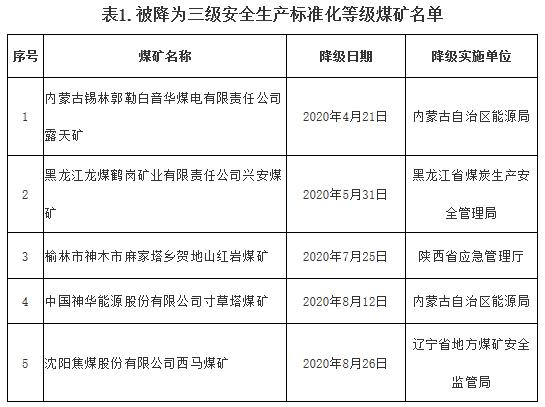 按照《煤礦安全生產(chǎn)標(biāo)準(zhǔn)化管理體系考核定級(jí)辦法(試行)》(煤安監(jiān)行管〔2020〕16號(hào))有關(guān)規(guī)定,內(nèi)蒙古錫林郭勒白音華煤電有限責(zé)任公司露天礦等5處煤礦一級(jí)安全生產(chǎn)標(biāo)準(zhǔn)化等級(jí)被降為三級(jí),詳見附表1。