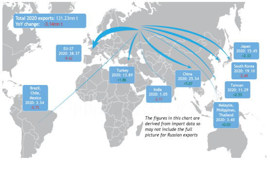 2020年,俄羅斯煤炭出口與上年基本持平。主要是7月-12月強勁的煤炭出口扯平了上半年的出口疲弱,遠東和南部港口增加的煤炭出口對沖了西北波羅的海沿岸港口煤炭出口的下滑。據(jù)外媒消息,2020年俄羅斯海運煤炭出口1.9億噸,略高于2019年的1.89億噸和2018年的1.822億噸。