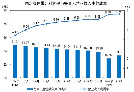 1—3月份,規(guī)模以上工業(yè)企業(yè)實(shí)現(xiàn)營(yíng)業(yè)收入27.48萬(wàn)億元,同比增長(zhǎng)38.7%;發(fā)生營(yíng)業(yè)成本22.91萬(wàn)億元,增長(zhǎng)36.5%;營(yíng)業(yè)收入利潤(rùn)率為6.64%,同比提高2.76個(gè)百分點(diǎn)。