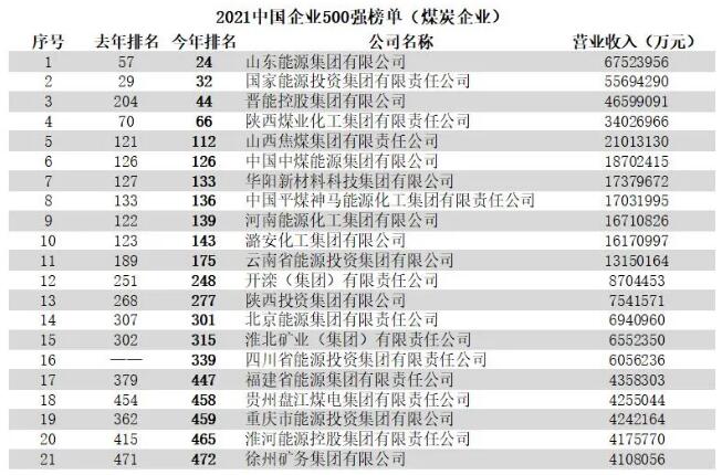 今年共有21家煤炭企業(yè)上榜。其中,山東能源集團有限公司、國家能源投資集團有限責任公司、晉能控股集團有限公司、陜西煤業(yè)化工集團有限責任公司入圍榜單前100名。四川省能源投資集團有限責任公司為新上榜企業(yè)。有8家企業(yè)排名較去年有所提升,11家企業(yè)排名下降,1家企業(yè)排名持平。