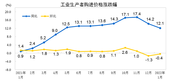 2022年1月份,全國工業(yè)生產(chǎn)者出廠價(jià)格同比上漲9.1%,環(huán)比下降0.2%;工業(yè)生產(chǎn)者購進(jìn)價(jià)格同比上漲12.1%,環(huán)比下降0.4%。