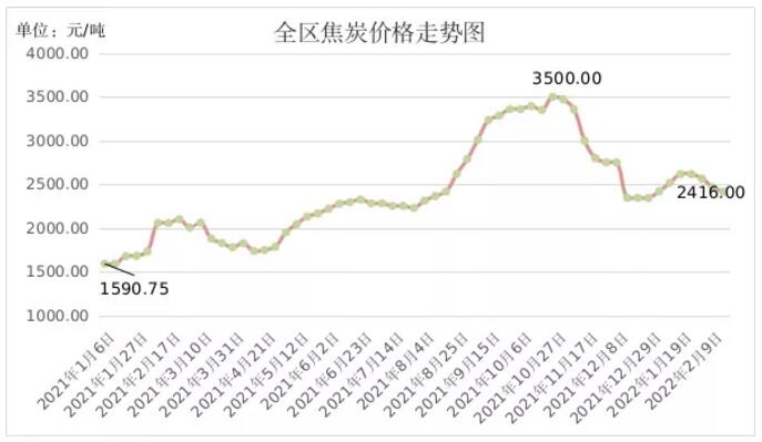 受需求低迷影響,本周內(nèi)蒙古焦炭價(jià)格繼續(xù)下降。2月16日,全區(qū)焦炭平均出廠價(jià)格為2416.00元/噸,環(huán)比下降2.03%,同比上漲17.44%。