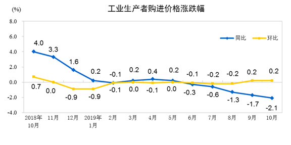2019年10月份,全國工業(yè)生產者出廠價格同比下降1.6%,環(huán)比上漲0.1%;工業(yè)生產者購進價格同比下降2.1%,環(huán)比上漲0.2%。1—10月平均,工業(yè)生產者出廠價格比去年同期下降0.2%,工業(yè)生產者購進價格下降0.5%。