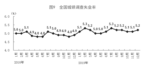 全年城鎮(zhèn)新增就業(yè)1352萬人,連續(xù)7年保持在1300萬人以上,明顯高于1100萬人以上的預(yù)期目標(biāo),完成全年目標(biāo)的122.9%。12月份,全國城鎮(zhèn)調(diào)查失業(yè)率為5.2%,2019年各月全國城鎮(zhèn)調(diào)查失業(yè)率保持在5.0%-5.3%之間,實(shí)現(xiàn)了低于5.5%左右的預(yù)期目標(biāo)。全國主要就業(yè)人員群體25-59歲人口調(diào)查失業(yè)率為4.7%。12月份,31個大城市城鎮(zhèn)調(diào)查失業(yè)率為5.2%。2019年末,城鎮(zhèn)登記失業(yè)率為3.62%,比上年末降低0.18個百分點(diǎn),符合4.5%以內(nèi)的預(yù)期目標(biāo)。年末全國就業(yè)人員77471萬人,其中城鎮(zhèn)就業(yè)人員44247萬人。全年農(nóng)民工總量29077萬人,比上年增加241萬人,增長0.8%。其中,本地農(nóng)民工11652萬人,增長0.7%;外出農(nóng)民工17425萬人,增長0.9%。農(nóng)民工月均收入水平3962元,比上年增長6.5%。