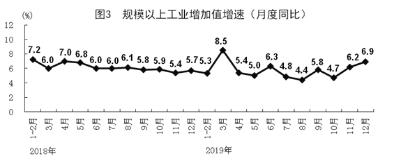 全年全國規(guī)模以上工業(yè)增加值比上年增長5.7%。分經(jīng)濟(jì)類型看,國有控股企業(yè)增加值增長4.8%;股份制企業(yè)增長6.8%,外商及港澳臺商投資企業(yè)增長2.0%;私營企業(yè)增長7.7%。分三大門類看,采礦業(yè)增加值增長5.0%,制造業(yè)增長6.0%,電力、熱力、燃?xì)饧八a(chǎn)和供應(yīng)業(yè)增長7.0%。高技術(shù)制造業(yè)和戰(zhàn)略性新興產(chǎn)業(yè)增加值分別比上年增長8.8%和8.4%,增速分別比規(guī)模以上工業(yè)快3.1和2.7個百分點(diǎn)。12月份,規(guī)模以上工業(yè)增加值同比增長6.9%,比上月加快0.7個百分點(diǎn),環(huán)比增長0.58%。12月份,制造業(yè)采購經(jīng)理指數(shù)(PMI)分項(xiàng)指數(shù)中,生產(chǎn)指數(shù)、新訂單指數(shù)和供應(yīng)商配送時間指數(shù)分別為53.2%,51.2%和51.1%,均高于臨界點(diǎn)。制造業(yè)生產(chǎn)經(jīng)營活動預(yù)期指數(shù)為54.4%,位于較高景氣區(qū)間。